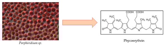 Even though research has mainly focused on PC due to its abundance and many health benefits, a fellow pigment, phycoerythrin (PE) (Figure 8), has shown great potential as a bioactive compound derived from microalgae. Red algae, particularly Porphyridium sp., have been extensively researched and used for R-PE on a commercial basis for a long time, rendering them the primary source of PE. Cyanobacteria, however, may develop into a different source for C-PE accumulation [125]. The PE market was valued at USD 4.2 million as of 2022, and is expected to reach USD 7.6 million by 2032, with a CAGR of 6.2% [126].