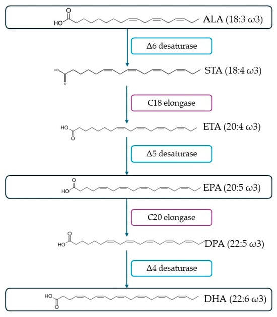 Fatty acids are the fundamental building blocks of lipids, which serve an important role as biological agents in processes involving energy storage, cell membrane structure, and fluidity, as well as signaling pathways [153,154]. Structurally, fatty acids are composed of a hydrocarbon skeleton equipped with a carboxylic end group [153]. Depending on their saturation degree, they can be categorized into saturated (no double bonds), monounsaturated (MUFAs) (one double bond), or polyunsaturated fatty acids (PUFAs) (two or more double bonds). Of these categories, PUFAs are of the greatest importance due to their participation in the different biological systems in humans. They can be further divided into ω-3 and ω-6 depending on the first carbon of the first double bond from the methyl end. ω-3 and ω-6 PUFAs are considered essential for humans, since they cannot be biosynthesized by them, due to the lack of enzymes Δ12- and Δ15- desaturases, which are responsible for introducing double bonds into the ω-6 and ω-3 carbons, respectively, but, at the same time, are necessary for their diet [155,156]. Linoleic acid (LA, 18:2ω6) and α-linolenic acid (ALA, 18:3ω3) are considered the precursors of many PUFAs, such as docosahexaenoic acid (DHA, 22:6ω3) and eicosapentaenoic acid (EPA, 20:5ω3), which are produced from ALA (Figure 9). However, their bioconversion rate is low, ranging between 10 and14%, and thus insufficient to cover the nutritional needs of humans [157]. Subsequently, they should be provided directly through dietary sources.