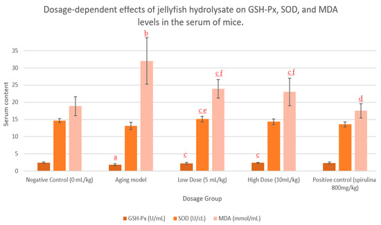 On top of providing valuable sources of nitrogen and amino acids, many bioactive MCPs have demonstrated powerful antioxidant, anti-microbial, and immunomodulatory effects. The active peptide products isolated from fish, sea cucumbers, sponges, urchins, mussels, and other marine life have shown the potential to lower oxidative stress, inhibit cellular senescence, and extend lifespans in multiple animal studies of aging [17,34,35]. For example, one study found that jellyfish collagen hydrolysate (JCH) improved the exercise tolerance of mice in a dose-dependent manner after 6 weeks [17]. In the same study, the authors used d-galactose to induce the aging process in mice, then investigated the effect of JCH on oxidative stress by measuring malondialdehyde (MDA), superoxide dismutase (SOD), and glutathione peroxidase (GSH-Px) activity [17]. MDA is a product of lipid peroxidation, which increases with age, whereas SOD and GSH-Px are enzymatic antioxidant systems that neutralize free radicals implicated in the aging process, wherein activity declines with age [18]. Significantly, the 6-week administration of JHC inhibited the decrease in GSH-Px/SOD activity and the increase in MDA seen in the ageing model [17]. These results are displayed in Figure 2 [17], showcasing the powerful in vivo antioxidant capacity of marine peptides and demonstrating their benefit in anti-aging products.