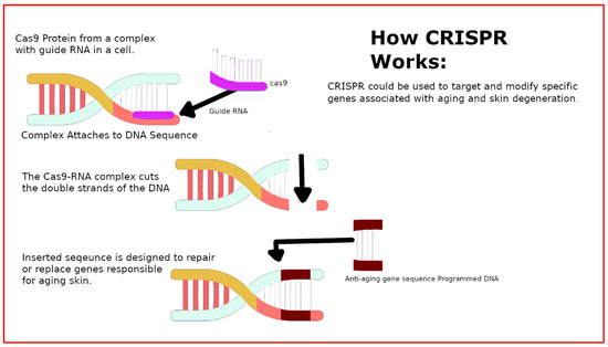 Illustration of the CRISPR-Cas9 Mechanism for Skin Regeneration. This graphic outlines the use of CRISPR-Cas9 technology for targeted gene editing in eukaryotic cells, specifically for skin regeneration. The process begins with the Cas9 protein forming a complex with a guide RNA that is complementary to a specific gene sequence associated with skin aging. This complex then locates and binds to the target DNA sequence, where Cas9 makes a precise cut. A new DNA sequence with the desired genetic information can then be inserted at the cut site for potential therapeutic purposes, such as reversing aging effects or repairing skin damage. This advanced molecular technique is also being applied to edit the genetic code of various organisms, encompassing eukaryotic cells similar to those in humans. Specifically, in the context of combating skin aging, this method allows for precise alterations to DNA sequences, facilitating the repair or reversal of age-related genetic changes in the skin. It might also offer a tool for curing genetically based diseases [46].
