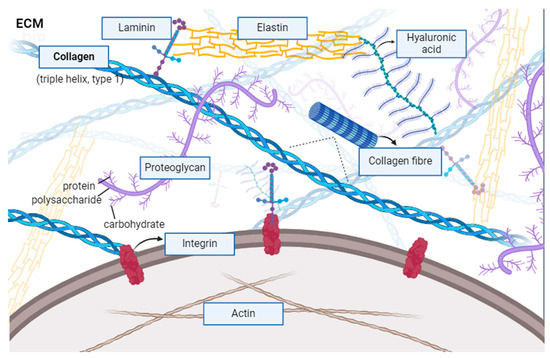 Collagen found in the ECM. The ECM is a dynamic network of proteins and molecules that play a fundamental role in organizing and maintaining tissue structure and function. Components of the ECM include fibrillar proteins (i.e., collagen, elastin) which confer tensile strength and elasticity, adhesive glycoproteins (i.e., fibronectins, laminins) which mediate cell–ECM interactions critical for tissue organization and homeostasis, and proteoglycans (i.e., fibromodulin), which can have biologically active properties (i.e., growth factors) and mediate ECM assembly and organization [65]. Created in Biorender.com.