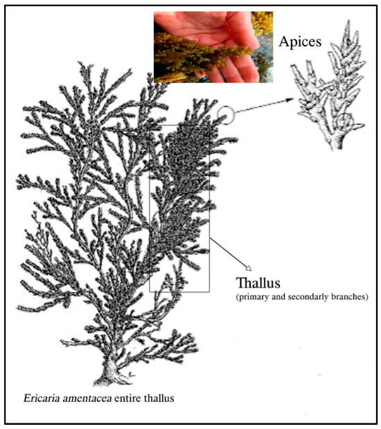 Schematic representation of E. amentacea seaweed body parts, and antioxidant activity of E. amentacea extracts in spectrophotometric tests.