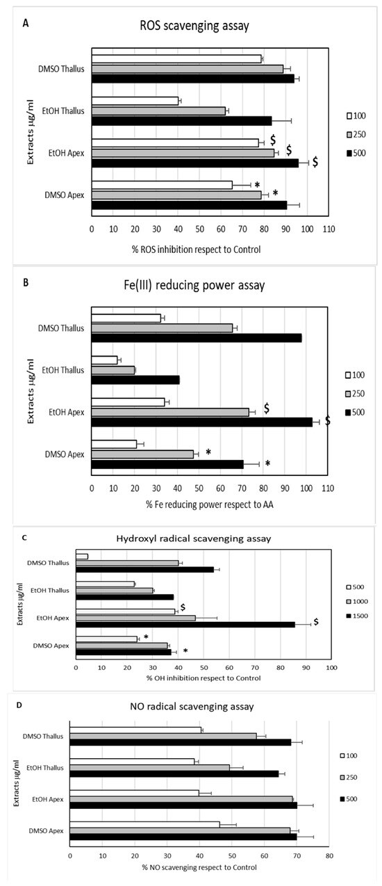 Marine seaweed displays anti-aging properties. In (A,C), * p < 0.05; Tukey of EtOH apex vs. EtOH thallus’ respective concentrations, $ p < 0.05. In (B), * p < 0.05; Tukey of EtOH apex vs. EtOH thallus’ respective concentrations, $ p < 0.005. (A) ROS scavenging activity. (B) Fe (III)-reducing power assay compared to ascorbic acid (AA). (C) OH radical scavenging activity. (D) NO radical scavenging activity. Taken from Mirata et al. (2023) [66].