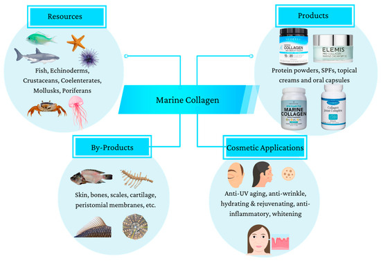 A potential explanation for the increasing popularity of marine collagen products may lie in the manufacturing, safety, and efficacy advantages that they provide. For one, marine sources are biodiverse, abundant, and easy to cultivate and modulate during their life cycles. Furthermore, marine collagen is easily absorbed by the body and efficiently utilized for collagen synthesis. These characteristics make it possible to harness the production of specific bioactive compounds involved in collagen synthesis and wound healing [50,67]. Further on, collagen-based cosmetics predominantly utilize Type I collagen, valued for its moisturizing, anti-wrinkle, anti-aging, wound-healing, and UV radiation protection properties [20]. Figure 8 further illustrates the various utilizations and applications of marine collagen in the cosmetic market.