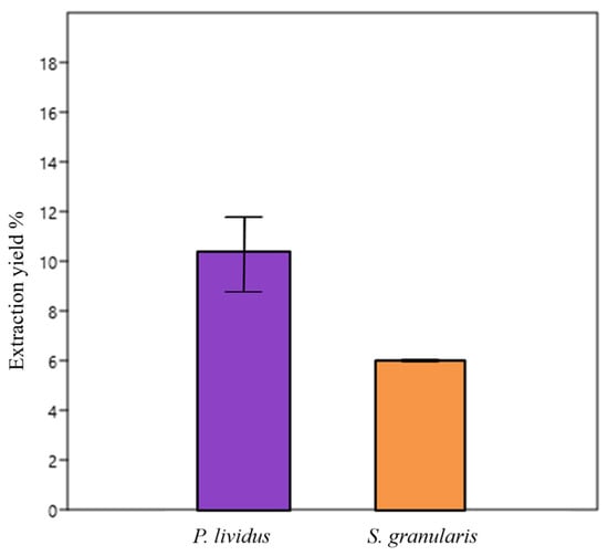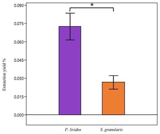 Yield of PHNQ extraction (% means ± st. dev) from the waste of the two species, P. lividus and S. granularis (both purple and white). * p < 0.05, Mann–Whitney test.