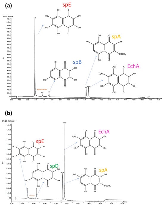 The PHNQs found in P. lividus were identified by UPLC-PDA-ESI-HR-MS as follows (Figure 2, tR = retention time): spinochrome E (SpE, tR = 2.9 min, m/z = 252.9988), spinochrome B (SpB, tR = 4.6 min, m/z = 221.0085), spinochrome A (SpA, tR = 9.2 min, m/z = 263.0190), and echinochrome A (EchA, tR = 9.5 min, m/z = 265.0350). Among the less common PHNQs, echinamine (tR = 3.78, m/z = 252.0145) was also identified.