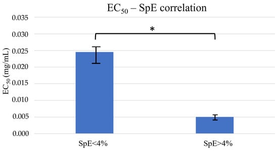 EC50 (means ± st. dev) correlated with % SpE. It is shown that PHNQ mixtures containing high percentages of SpE (>4%) were significantly (* p < 0.05, Mann–Whitney) characterised by lower EC50 values compared to mixtures with low percentages of SpE (<4%) regardless of the sea urchin species.