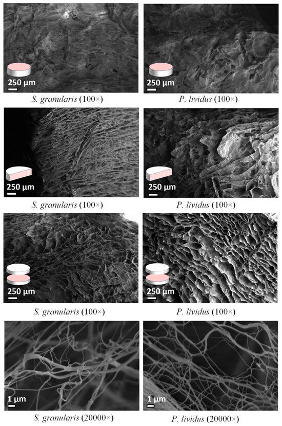 SEM images of S. granularis and P. lividus scaffolds displaying the spongy structure and a network of fibrils organised to form interconnected pores visible in the upper surface, cross section, and longitudinal section. The last two SEM pictures show fibrils magnification.
