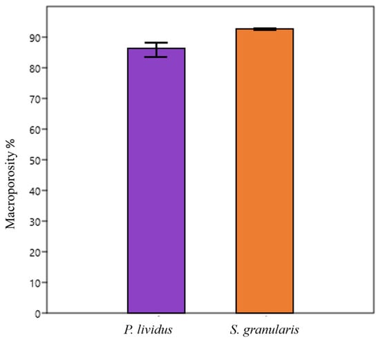 Although the scaffolds of S. granularis had a slightly higher average percentage of macroporosity compared to those of P. lividus (92.47 ± 0.6% and 85.59 ± 4.5% respectively), the difference was not statistically significant (Mann–Whitney, p > 0.05), (Figure 6).