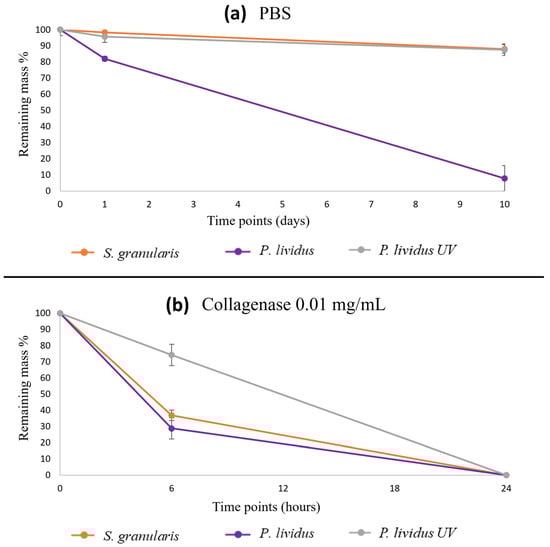 (a) Degradation kinetics of the S. granularis and P. lividus scaffolds, the latter also UV-crosslinked (average remaining mass % ± st.dev): S. granularis scaffolds were more stable, and they showed a similar degradation kinetics to those of P. lividus crosslinked scaffolds. (b) Degradation kinetics of the S. granularis and P. lividus scaffolds, the latter also as UV-crosslinked scaffold (average remaining mass % ± st. dev). Significance values are shown in the text. The statistics are reported in Tables S4 and S5 in the Supplementary Materials.