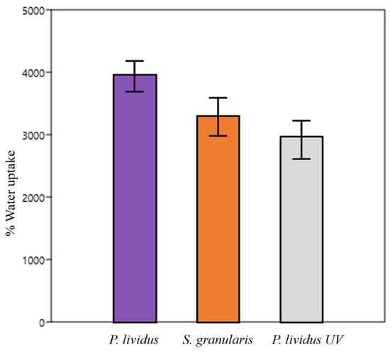 Water uptake (%) ± st. dev for P. lividus, S. granularis, and UV-cross-linked P. lividus scaffolds.