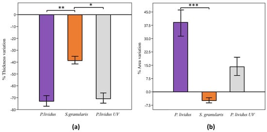 The percentage of thickness variation of non-crosslinked and crosslinked P. lividus scaffolds was significantly higher (Kruskal–Wallis, p < 0.05) than that of S. granularis scaffolds, which are, therefore, significantly more stable. The thickness variation was negative, indicating a decrease in thickness for all the scaffolds. The percentage area variation of the S. granularis scaffolds was significantly lower (Kruskal–Wallis, p < 0.001) than that of P. lividus scaffolds, again suggesting a greater stability. Crosslinked P. lividus scaffolds did not show significantly different values from either of the other two groups considered. P. lividus scaffolds (both cross-linked and non-cross-linked) always showed an increased area, whereas S. granularis scaffolds showed a decreased area (Figure 9).