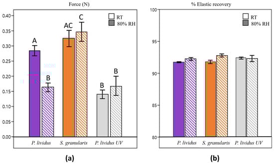 (a) Scaffolds’ stiffness (mean ± st. dev) expressed in force (newtons) under different conditions (RT: scaffolds’ stiffness after conditioning at room temperature; 80% RH: scaffolds’ stiffness after conditioning in a climatic chamber at 37 °C and 80% relative humidity). Same letter on the bar (A,B or C) corresponds to no statistically significant difference. Different letters correspond to statistically significant difference (p value between A and B < 0.05, p value between B and C < 0.05). (b) Scaffolds’ elastic recovery (mean % ± st. dev) expressed in % under different conditions (RT: scaffolds’ stiffness after conditioning at room temperature; 80% RH: scaffolds’ stiffness after conditioning in a climatic chamber at 37 °C and 80% relative humidity).
