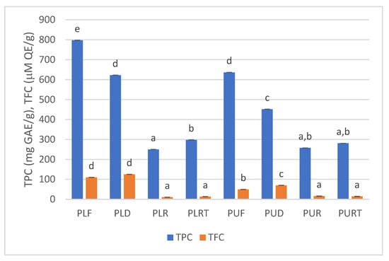 Total phenolic and flavonoids content of fresh (F), dehydrated (D), rehydrated (R) and thermally processed (RT) P. linearis (PL) and P. umbilicalis (PU) samples. Different letters indicate significant differences (p < 0.05) between samples for TPC and TFC.