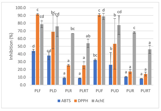 ABTS and DPPH radical scavenging activities and AchE inhibitory activity of fresh (F), dehydrated (D), rehydrated (R) and thermally processed (RT) P. linearis (PL) and P. umbilicalis (PU) samples. Different letters indicate significant differences (p < 0.05) between samples for each activity.