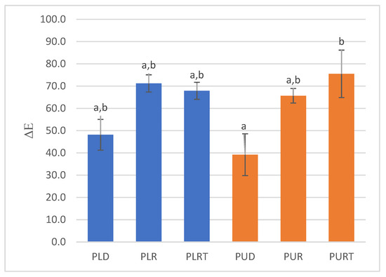 The change in color calculated from color parameters L*, a*, and b* is shown in Figure 3. The smaller values of ΔE indicate that samples are closer in color to fresh seaweeds. As can be seen, the dehydrated samples underwent a significantly lower color change (ΔEPUD = 39.2, ΔEPLD = 48.1). However, rehydration and thermal treatment had a strong effect on color change in the seaweeds (ΔE between 65.7 and 75.5). It was also observed that changes in color were not significantly different between samples subjected to rehydration and thermal treatment. After rehydration, heating to a high temperature (90 °C) had almost no effect on the color of the samples.