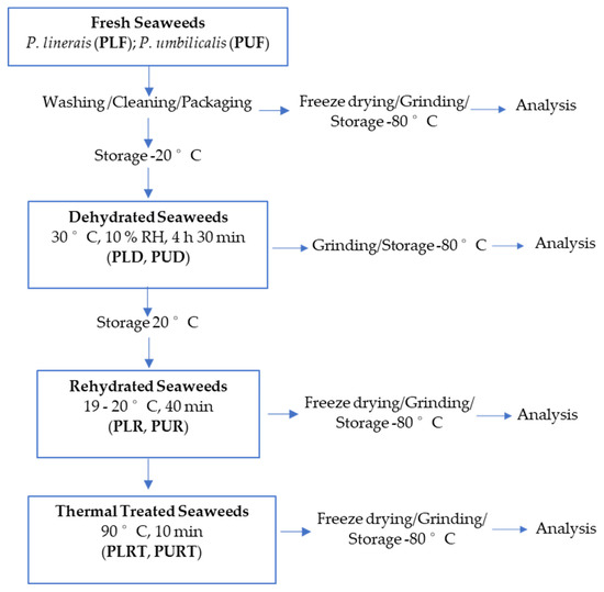 All seaweeds were previously freeze-dried, except the dehydrated ones, milled with a MM400 Mills (Retsch, Haan, Germany), and stored at −80 °C until analysis (Figure 4).