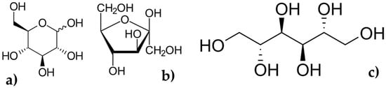 Sugars structures: (a) glucose; (b) fructose; (c) mannitol.