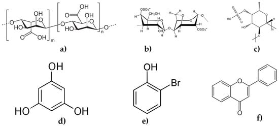 Seaweeds compound structure: (a) sodium alginate; (b) iota-carrageenan; (c) fucoidan; (d) phloroglucinol; (e) bromophenol; (f) flavonoid.