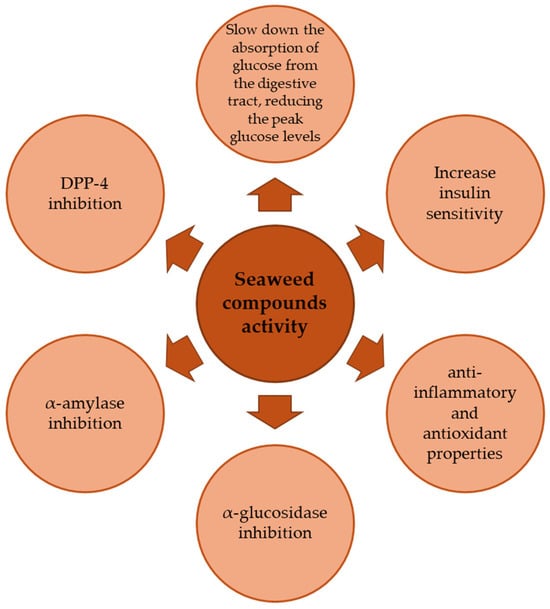 Polysaccharides isolated from seaweeds have been shown to improve insulin sensitivity, increase glucose uptake, and reduce blood glucose levels [7]. Additionally, polyphenols found in seaweeds have been shown to inhibit the activity of α-glucosidase, an enzyme that breaks down complex carbohydrates into glucose, leading to a reduction in postprandial blood glucose levels [8]. Peptides isolated from seaweeds have also demonstrated potential as antidiabetic agents, with some peptides showing insulin-like activity [9]. Despite these potential benefits of seaweeds compounds, there are scarce results from seaweed-based drugs for diabetes therapeutics.