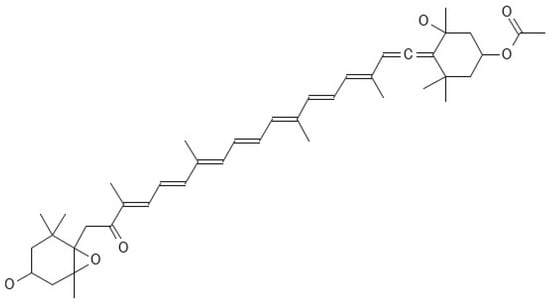 Seaweed compounds have been shown to have several mechanisms of action that can help to regulate glycemic levels and prevent diabetic complications [6,13]. Overall, the mechanisms of action of seaweed compounds in glycemic regulation and prevention of diabetic complications are diverse and complex. However, the evidence suggests that seaweed compounds have great potential as natural and safe alternatives to traditional diabetes treatments [84,89,90]. For example, inhibiting α-glucosidase can help slow the absorption of carbohydrates and prevent spikes in blood glucose levels, since α-glucosidase is an enzyme that breaks down complex carbohydrates into simple sugars. Seaweed compounds such as fucoxanthin (Figure 5) have been shown to inhibit α-glucosidase activity [76,106,107].