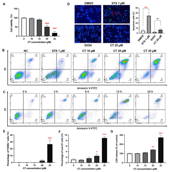 Figure 1. CT induced the cell death of human A549 cells. (A) CT inhibited the cell viability of human A549 cells. Cell viability was assessed using CCK-8 kit after the treatment of CT at different concentrations (10–25 µM) for 24 h. Statistical significance was determined using one-way ANOVA with Dunnett’s post-test, n = 3, *** p < 0.001 compared with the negative control (NC) group. (B) Typical diagram of annexin V/PI stain by flow cytometry. A549 cells were treated with different concentrations of CT for 24 h and subjected to annexin V and PI double staining. (C) Time-manner of typical diagram of annexin V/PI stain after treating with CT. A549 cells were treated with 20 µM CT for 3, 6, 12, 24 h and subjected to annexin V and PI double staining. (D) Detection of apoptosis using Hoechst 33342 staining in CT-treated cells. STS group showed many apoptotic cells with condensed (green arrows) and fragmented (red arrows) nuclei. The cells treated with 20 µM CT for 24 h showed a few apoptotic cells with condensed nuclei (Scale bar: 100 μm). Statistical significance was determined using one-way ANOVA with Tukey’s post-test in three different fields of view, *** p < 0.001 compared with the DMSO group, ns compared with ethanol (EtOH) group. (E) The TUNEL assay of A549 cells under CT treatment for 24 h. One-way ANOVA with Dunnett’s post-test was performed, n = 3, *** p < 0.001 compared with the control group. (F) The cell percentage of sub-G1 peak was determined following CT treatment for 24 h. One-way ANOVA with Dunnett’s post-test was performed, n = 3, * p < 0.05, *** p < 0.001 compared with the NC group. (G) CT increased LDH release in A549 cells. The assay was performed after the treatment of CT at different concentrations for 24 h. One-way ANOVA with Dunnett’s post-test was performed, n = 3, ** p < 0.005, *** p < 0.001 compared with the NC group.