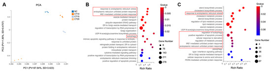 Figure 2. RNA-seq analysis of different concentrations of CT-treated A549 cells. (A) PCA analysis using most variable genes revealed the separation of four groups. PCA identifies the differences among each group, n = 3. (B) GO analysis of the upregulated gene clusters in CT 20 µM treatment groups. The function of Q value ≤ 0.05 was considered a significant enrichment. (C) GO analysis of the upregulated gene clusters in CT 15 µM treatment groups. ER stress and autophagy-related biological processes were highlighted in red boxes in B and C.