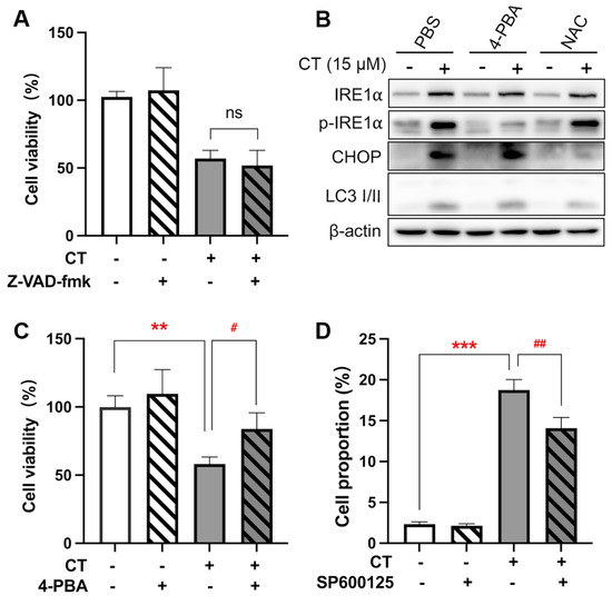 Figure 3. CT was associated with the ER stress process in A549 cells. (A) The effect of the pan-caspase inhibitor on CT-induced cell death. The cells were pre-treated with 20 µM Z-VAD-fmk for 1 h, then incubated with 20 µM CT for 24 h. Cell viability was assessed using a CCK-8 kit. One-way ANOVA with Tukey’s post-test was performed, n = 4, ns compared with CT group. (B) WB of ER stress-associated protein levels in A549 cell lines treated with CT. The cells were pre-treated with 1 mM 4-PBA or 1 mM NAC for 1 h, then incubated with CT at 15 µM for 24 h. (C) The effect of ER stress inhibitor on CT-induced cell death. The cells were pre-treated with 1 mM 4-PBA for 1 h, then incubated with 20 µM CT for 24 h. Cell viability was assessed using a CCK-8 kit. Statistical significance was determined using an unpaired t-test, n = 3. # p < 0.05 compared with the CT 20 µM group. ** p < 0.005 compared with the NC group. (D) Percentage of annexin V+/PI+ and annexin V+/PI cells after being treated with CT. A549 cells were pre-treated with 10 µM SP600125 for 1 h, then incubated with 20 µM CT for a further 24 h and subjected to annexin V and PI double staining. Statistical significance was determined using one-way ANOVA with Tukey’s post-test, n = 3. ## p < 0.005 compared with the CT group, *** p < 0.001 compared with the NC group.