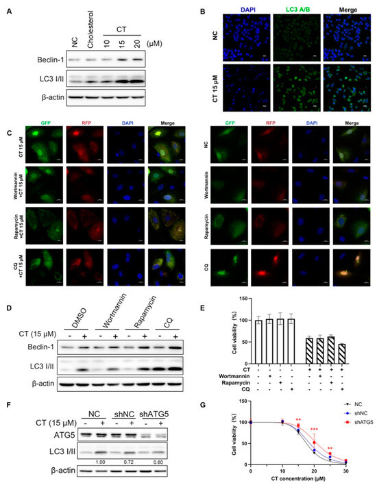 Figure 4. Autophagy occurred in A549 cells in the presence of CT. (A) WB of autophagy markers levels in A549 cell lines treated with a series dose of CT. The cells were treated with 10, 15, and 20 µM CT for 24 h, regarding cholesterol (20 µM) as an isotype control. β-actin was used as a loading control. (B) Immunofluorescence detection of cytoplasmatic LC3 levels in A549 cells exposed to 15 µM CT for 24 h. Upper row: negative control cells. Lower row: CT 15 µM-treated cells. Left column: DAPI-labeled nuclei. Middle column: anti-LC3 antibody conjugated FITC visualized LC3 puncta. Right column: two-color overlay showed diffuse LC3 cytoplasmic puncta (Scale bar: 20 µm). (C) Presence of autophagosomes (yellow) in mRFP-GFP-LC3 adenovirus-transfected cells after 15 µM CT treatment with or without autophagy-interfering reagents (Scale bar: 20 μm). (D) WB of LC3 levels under the presence of three types of autophagy-interfering reagents and 15 µM CT. The cells were pre-treated with wortmannin (50 nM), rapamycin (2 µM), or CQ (10 µM) for 1 h, then incubated with 15 µM CT for 24 h. (E) The effect of autophagy-interfering reagents on CT-induced cell death. The cells were pre-treated with 50 nM wortmannin, 2 µM rapamycin, or 10 µM CQ for 1 h, then incubated with 20 µM CT for 24 h. Cell viability was assessed using a CCK-8 kit. Statistical significance was determined using two-way ANOVA with Dunnett’s post-test, n = 3. (F) WB of LC3 levels in Atg5-silenced A549 cells. The cells were incubated with 15 µM CT for 24 h. (G) The cytotoxicity of CT in Atg5-silenced A549 cells. The shAGT5-transfected A549 cells were incubated with a series dose of CT for 24 h. Cell viability was assessed using a CCK-8 kit. Statistical significance was determined using two-way ANOVA with Dunnett’s post-test, n = 3. ** p < 0.005, *** p < 0.001, shATG5 cells compared with the NC group.