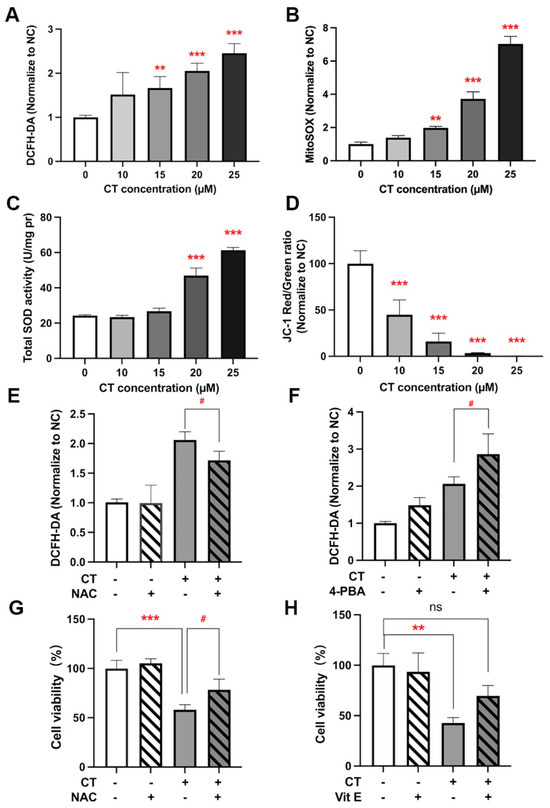 Figure 5. ROS generation activated ER stress and reduced cell viability. (A) Analysis of ROS levels in A549 cells under CT exposure. A549 cells were treated with a series of doses of CT for 24 h. Then, cells were harvested and stained with DCFH-DA. Statistical significance was determined using one-way ANOVA with Dunnett’s post-test, ** p < 0.005, *** p < 0.001 compared with the NC group. (B) Analysis of MitoSOX levels in A549 cells under CT exposure. Cells were harvested and stained with MitoSOX after being treated with a series of doses of CT for 24 h. Statistical significance was determined using one-way ANOVA with Dunnett’s post-test, ** p < 0.005, *** p < 0.001 compared with the NC group. (C) Total SOD activity of A549 cells under CT exposure. Statistical significance was determined using one-way ANOVA with Dunnett’s post-test, *** p < 0.001 compared with the NC group. (D) The mitochondrial membrane potential of A549 cells was evaluated by using JC-1 staining. Statistical significance was determined using one-way ANOVA with Dunnett’s post-test, *** p < 0.001 compared with the NC group. (E) The effect of NAC on CT-induced ROS upregulation by flow cytometer. A549 cells were incubated with 1 mM NAC for 1 h before incubating with 20 µM CT for a further 24 h. Statistical significance was determined using two-way ANOVA with Šídák’s post-test, # p < 0.05 compared with the CT group. (F) The effect of 4-PBA on CT-induced ROS upregulation by flow cytometer. A549 cells were incubated with 1 mM 4-PBA for 1 h before incubating with 20 µM CT for a further 24 h. Statistical significance was determined using two-way ANOVA with Šídák’s post-test, # p < 0.05 compared with the CT group. (G,H) The effect of antioxidants on CT-induced cell death. The cells were pre-treated with 1 mM NAC or 10 µM Vit E for 1 h, then incubated with 20 µM CT for a further 24 h. Cell viability was assessed using a CCK-8 kit. Statistical significance was determined using one-way ANOVA with Tukey’s post-test, # p < 0.05 compared with the CT 20 µM group. ** p < 0.005, *** p < 0.001, and ns compared with the NC group.