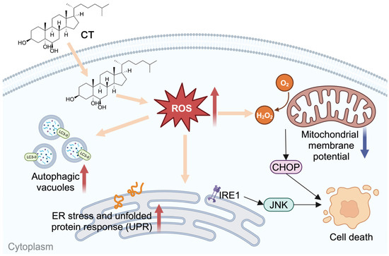 CT is one of the most abundant and active auto-oxidative forms of cholesterol in mammals [18]. However, comparatively less information is available on the CT than those of 7-KC and 7β-OHC [13]. CT was reported for the first time in 2005 to cause increased ROS in CHO cells and was then found to associate with nitric oxide synthase and modulated cyclooxygenase-2 expression via the PI3K-Akt-eNOS-dependent pathway [19,20,21]. CT was also a determinant in the impairment of mitochondrial function [22]. It was able to induce an increase in intracellular Ca2+ and Ca2+-dependent ROS generation in marrow stromal cells and increase the calcifying nodule formation, calcium deposition, alkaline phosphatase activity, and the apoptosis of nodular cells in calcifying vascular smooth muscle cells [23,24]. An in vitro study suggested that CT is more potent than other oxysterols as an inducer of apoptosis [25]. In the course of our ongoing search for bioactive molecules from marine sources, CT was repeatedly obtained from the South China Sea gorgonians, showing a significant tumor cell growth-inhibitory activity against A549 cells [4]. In the present study, the effects of CT on A549 cell death were investigated, showing that CT could induce ER stress and autophagy in A549 cells by increasing the levels of ROS.