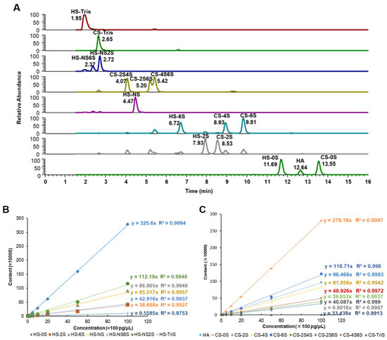MRM is a highly sensitive analysis mode in LC-MS/MS, which is very suitable for the detection of GAGs in tissue samples with a complex composition [25,26,27,28]. Here, the MRM of the 2-AMAC-labeled seven HS-derived disaccharides, eight CS-derived disaccharides, and one HA-derived disaccharide were isolated (Figure 1A). The linear equation describing the correlation between the relative abundance of each disaccharide in the range from 20 pg to 10,000 pg and the concentration is given in Table S1. The standard curves (Figure 1B,C) were used to calculate the content of each derived standard disaccharide in the sample. After calculation, the percentage of each disaccharide in different GAGs was listed.