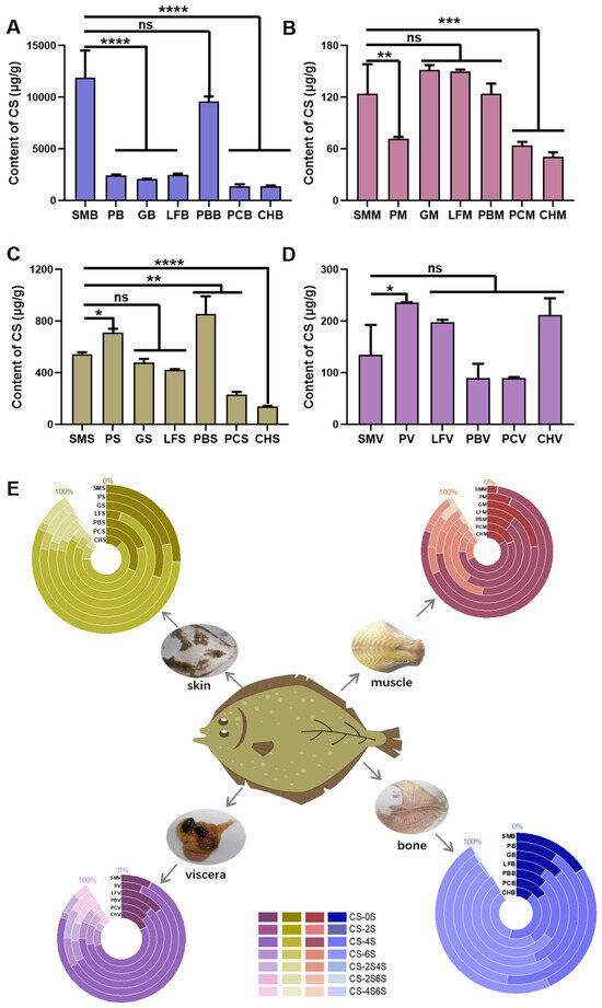 (A–D) The content of CS in (A) bone, (B) muscle, (C) skin, and (D) viscera of seven flounders. (E) CS disaccharide composition. Data are shown as the mean ± SD (n = 3) with error bars representing standard errors. * p < 0.05, ** p < 0.01, *** p < 0.001, **** p < 0.0001, ns p > 0.05.