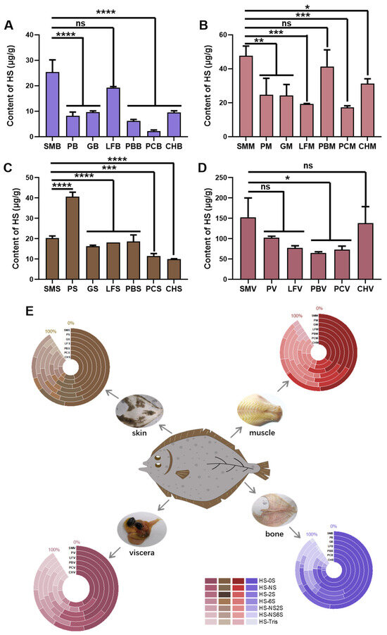 (A–D) The content of HS in (A) bone, (B) muscle, (C) skin, and (D) viscera of seven flounders. (E) HS disaccharide composition. Data are shown as the mean ± SD (n = 3) with error bars representing standard errors. * p < 0.05, ** p < 0.01, *** p < 0.001, **** p < 0.0001, ns p > 0.05.