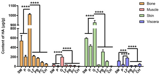 The HA content in bone, muscle, skin, and viscera of seven flounders. Data are shown as the mean ± SD (n = 3) with error bars representing standard errors. *** p < 0.001, **** p < 0.0001.