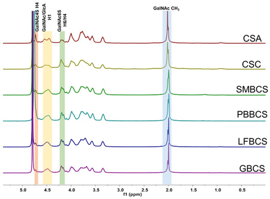 Combining the two-dimensional spectra (Figures S3 and S4) with existing reports [20,21,36], the 1H-NMR and 13C-NMR signals for CSA and LFBCS are attributed. In 1H-NMR, the anomeric hydrogen H1 signals of GalNAc and GlcA are assigned at 4.53 and 4.46 ppm, respectively. The H2 and H3 signals of GlcA were found at 3.35 and 3.57 ppm, respectively. In addition, the H2 signal of GlcA2S was observed at 4.09 ppm. The H6 signals of GalNAc6S and GalNAc4S are distributed at 4.20 and 3.80 ppm, respectively. The H4 signals of GalNAc6S and GalNAc4S were clearly observed at 4.16 and 4.73 ppm, and the 4S/6S ratios were calculated to be 2.32 (CSA) and 0.76 (LFBCS) based on their peak area. In the 13C-NMR spectra, compared with GalNAc4S, the intensity of the characteristic carbon signal corresponding to GalNAc6S of LFBCS is dominant, and it is determined that CS-6S is dominant in LFB, while in CSA, on the contrary, CS-4S is dominant. Other hydrogen signals are clustered at 3.90–4.05 ppm and 3.60–3.83 ppm, making them difficult to distinguish. The chemical shift signals in the carbon spectrum are annotated in Figures S3B and S4B. NMR spectra of CS from different sources are shown in Figure 6. The signal peak shapes in the 1H-NMR spectra of LFBCS, GBCS, SMBCS, PBBCS, and CSC are very similar, indicating that those CSs are composed of similar disaccharide components. The H4 characteristic signal intensity of GalNAc6S and GalNAc4S can be used to determine the main disaccharide composition of CS, and here, it is certain that all CS extracted from fish bone is CSC (CS-6S is the main disaccharide component).