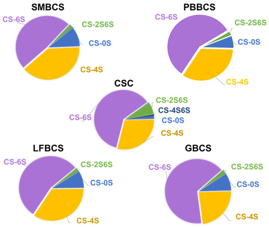 The analysis of unsaturated disaccharide composition of SMBCS, PBBCS, LFBCS, GBCS, and CSC is shown in Figure 6 and Table S6. It can be seen that the five CSs are dominated by CS-6S, among which the proportion of CS-6S in GB is the highest (65.67%), followed by commercial CSC (61.12%), while CS-6S accounts for 57.48, 54.78, and 48.47% in PBBCS, LFBCS, and SMBCS, respectively. The 4S/6S ratios for CS from different sources are 0.81 (SMBCS), 0.60 (PBBCS), 0.63 (LFBCS), and 0.36 (GBCS). Compared to the tissue analysis in Section 2.2 and Section 2.3 (Figure 3 and Table S3), the proportion of CS-6S in GB and LFB was increased, while the proportion was decreased in SMB. The reason for this difference is caused by the purification process. PBB, GB, and LFB effectively separated the components of CS-0S under low salt concentration conditions, resulting in a decrease in the proportion of fragments with CS-0S and strengthening the purification of fragments with CS-6S, while SMB was eluted. In addition to the separation of low-sulfated fragments, the CS-6S containing part was also separated, resulting in a close proportion of fragments with CS-4S and CS-6S. Overall, CS from flounder bone is very suitable as a substitute for shark-derived CSC. It is worth mentioning that its raw materials are easy to obtain, the obtained CS structure is mainly CS-6S, the molecular weight is uniform, and the purification process is relatively easy.