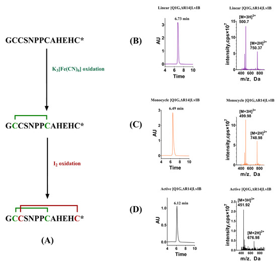 Purification and mass spectrometry identification of [Q1G, ΔR14]LvIB during the oxidative folding process. (A) The sequence of [Q1G, ΔR14]LvIB and the disulfide bond formation strategy; (B) purification and identification of linear peptides; (C) first-step oxidative folding. Purification and identification of monocyclic products; (D) second disulfide formed. Purification and identification of final product. All experimental procedures of RP-HPLC with the gradient of 2~70% in 30 min at a flow rate of 12 mL/min. * indicates the C-terminal amide.