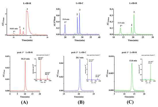 Purification and identification of fluorescent conotoxins. LvIB-R (A), LvIB-C (B), and LvIB-B (C). The peak 1* of the purification procedure represents the fluorescent coupling peptides. The molecular weight of peak 1* was identified by mass spectrometry, which was consistent with the theoretical value. The purification elution gradient was set to 2~20% solution B in 5 min, and 20~70% solution B in 5.01~40 min, at a flow rate of 12 mL/min.