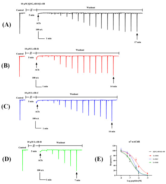 The potency of [Q1G, ΔR14]LvIB fluorescent analogs for rat α7 nAChRs heterologously expressed in X. laevis oocytes. (A–D) [Q1G, ΔR14]LvIB and three fluorescent analogs display different reversibility after blocking with 10 μM peptides. [Q1G, ΔR14]LvIB (A); LvIB-R (B); LvIB-C (C); LvIB-B (D). The control indicates the response to 200 μM ACh. The oocytes were incubated with 10 μM peptides for 5 min followed by the application of ACh. The ND96 flow rate was 2 mL/min. (E) The concentration–response curves of [Q1G, ΔR14]LvIB and its fluorescent analogs.