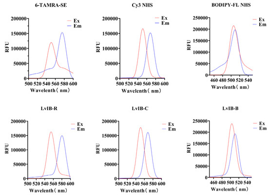 The unique molecular structures and conjugated double bonds of fluorescent dyes 6-TAMRA-SE, Cy3 NHS, and BODIPY-FL NHS provide sensitive fluorescence signals. When [Q1G, ΔR14]LvIB is coupled with different fluorophores, the fluorescence spectrum of the fluorescent analogs should not change significantly compared with the fluorescent dye. The excitation/emission (Ex/Em) values of the fluorescent molecules 6-TAMRA-SE, Cy3 NHS ester, and BODIPY-FL NHS ester were 550 nm/575 nm, 550 nm/570 nm, and 505 nm/510 nm, respectively, and the Ex/Em value of LvIB-R, LvIB-C, and LvIB-B were 555 nm/580 nm, 550 nm/570 nm, and 505 nm/510 nm, respectively. The results indicated that the wave change trend of the fluorescence spectrum was similar to the wave change trend of the fluorescent molecule itself, and the excitation wavelength and emission wavelength were not significantly different. The result is shown in Figure 4.