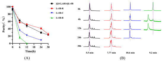 Stability analysis of fluorescent analogs in aCSF. (A) The line graph represents the residual degradation rate of [Q1G, ΔR14]LvIB and its fluorescent analogs. (B) The main peak degradation process of each peptide at different times.