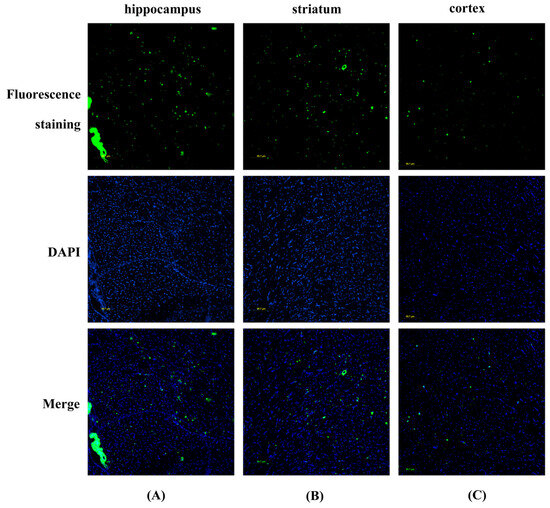 LvIB-B showed obvious fluorescence distribution in the hippocampus, striatum, and cortex in rat brain slices. The top row is the green fluorescence emitted by LvIB-B, the middle row is the blue fluorescence emitted by DAPI after nuclear staining, and the bottom row is the combination of green and blue fluorescence. (A) The hippocampus was labeled with LvIB-B to a large number of receptors, showing green fluorescence. (B) More fluorescence was also seen in the striatum region. (C) Cortical areas are marked with a small amount of α7 nAChRs, with less distribution in the cortex than in the hippocampus and striatum areas.