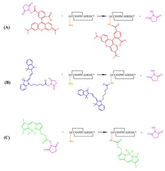 Schematic representation of the fluorescent molecules conjugated with α-CTx [Q1G, ΔR14]LvΙB. (A). 6-TAMRA-SE (LvIB-R), (B) Cy3 NHS ester (LvIB-C), and (C) BODIPY-FL NHS Ester (LvIB-B). * represents C-terminal amidation.