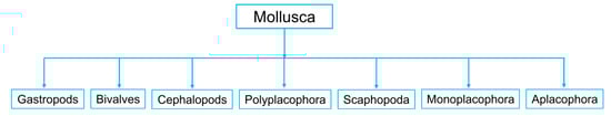 A broad group of invertebrate organisms that make up the phylum Mollusca are known as marine molluscs, or simply molluscs [21]. They can be found in a variety of marine settings, including oceans, seas, and estuaries, and they play a variety of ecological roles in marine ecosystems [22,23]. Molluscs are distinguished by their soft bodies, which are frequently shielded by hard shells; however, not all molluscs have shells [21,24]. Snails, clams, squids, and octopuses are among the well-known and significant creatures that belong to this phylum [20,25,26]. Based on their anatomical characteristics and ecological functions, molluscs can be roughly divided into seven main groups as mentioned in Figure 1 below, with each having distinct characteristics and adaptations [27].