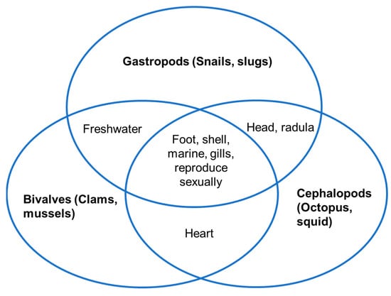 Among all these classes of molluscs, the three that can be classified as the major classes are viz Gastropods, Bivalves, and Cephalopods, and we can find their main similarities in Figure 2, below [10].