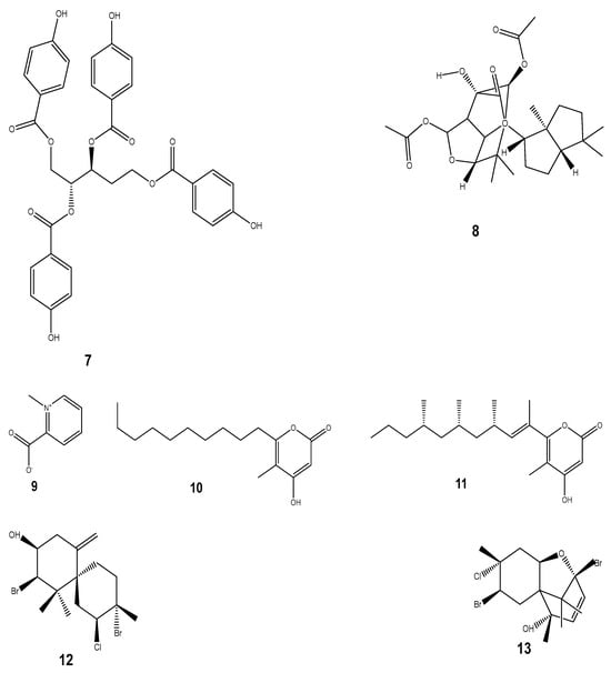 - Pereira, R.B.; Andrade, P.B.; Valentão, P. Chemical diversity and biological properties of secondary metabolites from sea hares of Aplysia genus. Mar. Drugs 2016, 14, 39. [Google Scholar] [CrossRef] [PubMed]