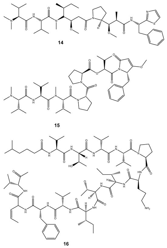 - Bai, R.; Pettit, G.R.; Kamel, E. Binding of dolastatin 10 to tubulin at a distinct site for peptide antimitotic agents near the exchangeable nucleotide and vinca alkaloid sites. J. Biol. Chem. 1990, 265, 17141–17149. [Google Scholar] [CrossRef] [PubMed]