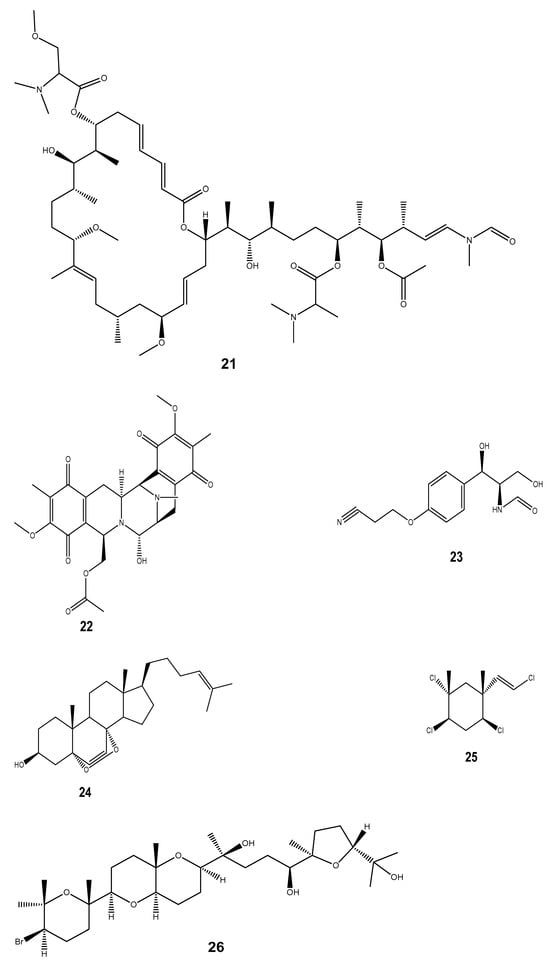 - Sugumaran, A.; Pandiyan, R.; Kandasamy, P.; Antoniraj, M.G.; Navabshan, I.; Sakthivel, B.; Dharmaraj, S.; Chinnaiyan, S.K.; Ashokkumar, V.; Ngamcharussrivichai, C. Marine biome-derived secondary metabolites, a class of promising antineoplastic agents: A systematic review on their classification, mechanism of action and future perspectives. Sci. Total Environ. 2022, 836, 155445. [Google Scholar] [CrossRef] [PubMed]