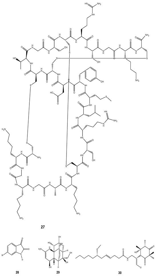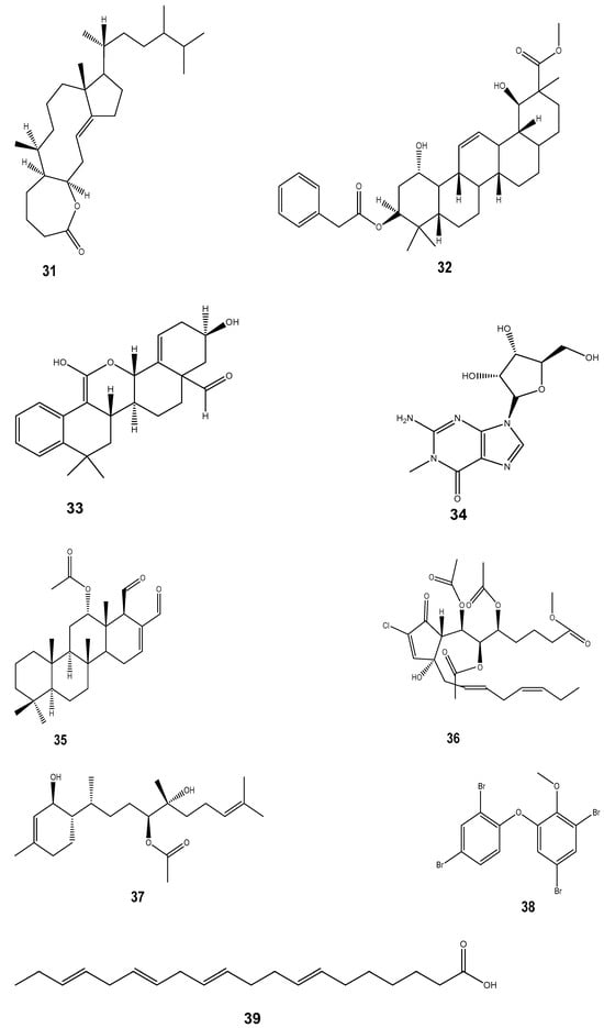 Inflammation is the complex biological response of the vascular system which arises as the product of oxidative stress [159]. It is usually associated with pains and other sufferings requiring immediate medication. Great progress has been made in recent decades towards understanding the neural substrates of pain relief and identifying novel molecular targets for anti-inflammatory and analgesic drug development [160]. A series of bioactive compounds with promising anti-inflammatory and analgesic properties have been identified and isolated from marine molluscs [147]. Peptides and proteins having analgesic and anti-inflammatory characteristics are a frequent mechanism of action for these properties [161]. Conotoxins are one prominent case in point. Conus snails’ (genus Conus) venom contains tiny peptides known as conotoxins [14]. These toxins are used by cone snails, a type of marine mollusc, to paralyze their prey [162]. In the neurological system, conotoxins can interact with ion channels and receptors. Some of them target nicotinic acetylcholine receptors, calcium channels, or voltage-gated sodium channels [163]. Conotoxins can interfere with pain signals and lessen inflammation by blocking or altering the activation of these channels [147]. Several reported marine molluscs have bioactive compounds possessing anti-inflammatory/ analgesic properties including the Ziconotide (27) isolated from Conus geographus and Conus magus [147], 6-bromoisatin (28) from the Australian marine mollusc Dicathais orbita [20], and tetrodotoxins (29) from bivalves and gastropod samples [164]. We also noted the Malyngamide S derivative (30) obtained from Bursatella leachii, the lactonic disecosteroid 9-disecoergosta-8-en-α-homo-6a-oxa-1-one (31) from Babylonia spirata, the phenylacetyloxy-trimethylpicene-23-carboxylate derivative (32) from Crassostrea madrasensis, and the benzo[h]naphtho[1,2-c] chromene derivative (33) from Perna viridis [20]. Other compounds exhibited this analgesic property, among which was 1-methyl-isoguanosine (34) isolated from the nudibranch Anisodoris nobilis [154], Scalaradial (35) from Glossodoris pallida, Punaglandin (36) from Tritonia sp. and Dactyloditerpenol acetate (37) from Aplysia dactylomela [13]. A polybrominated diphenyl ether (38) isolated from Aplysia dactylomela [156], and 17-eicosatetraenoic acid (39) from Perna canaliculus have also been reported [165] (Figure 5).